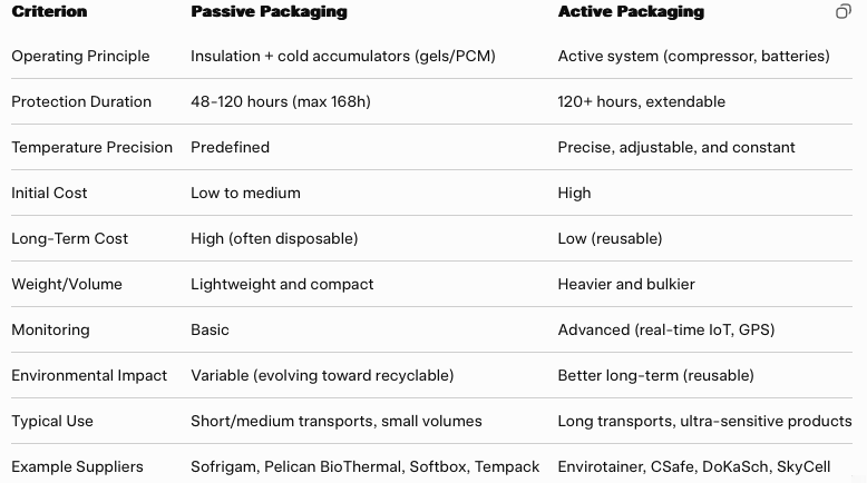 Passive packaging relies on enhanced thermal insulation combined with cold accumulators (eutectic gels or phase-change materials - PCM). They require no external energy source and are particularly suitable for short- to medium-duration transports (typically 48 to 120 hours, up to 168 hours for top-tier models), small volumes, and last-mile delivery. Their advantages include low initial cost, reduced weight, and ease of use. However, protection duration is limited, monitoring is basic (optional data loggers), and they are often single-use or limited-use, increasing long-term costs. Main suppliers: Sofrigam (France), Pelican BioThermal (Crēdo), Softbox Systems, Tempack, Cryopak.