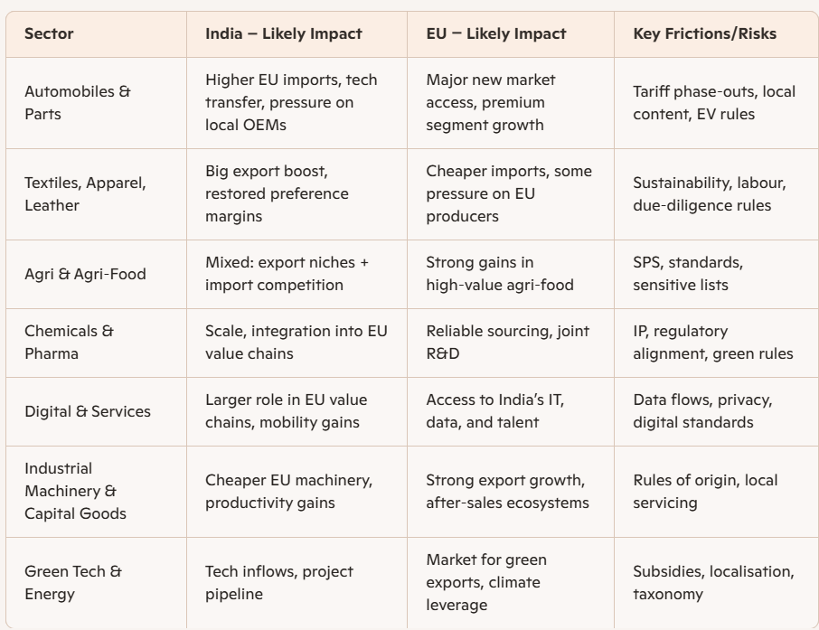 For the EU, the FTA serves multiple strategic objectives: diversifying supply chains away from over‑dependence on China, expanding export opportunities in industrial goods, agri‑food, pharmaceuticals, and high‑value manufacturing, and reinforcing its geopolitical presence in the Indo‑Pacific. For India, the agreement is equally transformative, offering unprecedented market access for more than 99% of its exports, supporting its long‑term development vision under India@2047, and enabling Indian industries—from textiles and machinery to chemicals, pharmaceuticals, and processed foods—to integrate more deeply into European value chains. The FTA is expected to significantly increase bilateral trade, which already reached €120 billion in goods in 2024, and to support India’s export ambitions, including its target of INR 6.4 lakh crore in exports to the EU in 2024–25.